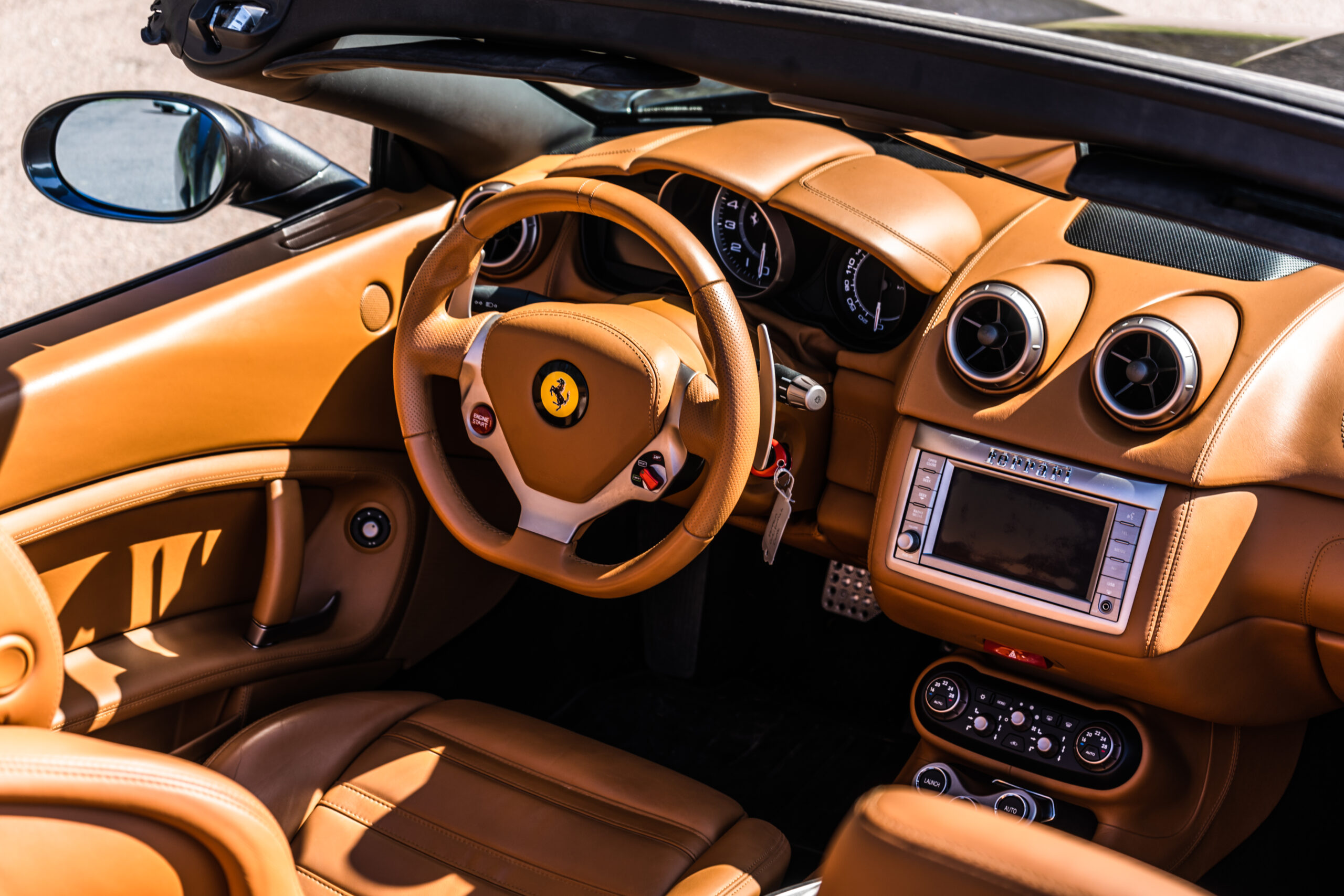 Enzo Ferrari sagde, løst oversat ”Bed et barn tegne en bil og han vil ganske sikkert farve den rød” og det er da også den farve de oftest ses i. Jeg har dog altid elsket de købere, der uanset mærke og model vælger, at bestille en atypisk farve. At de tør bryde med ”kodekset” og bestille en blå Porsche, en sort Lamborghini eller som i det her tilfælde: en Grigio Silverstone gråmetal Ferrari. Kabinefarven: Tradizione Beige er også lidt mørkere og ses ikke så ofte, som den lysere beige kabinefarve. Jeg synes personligt at kabinen er helt fantastisk i forårs solen